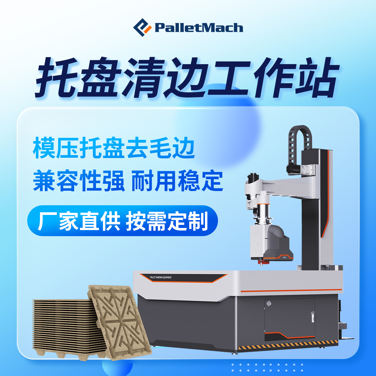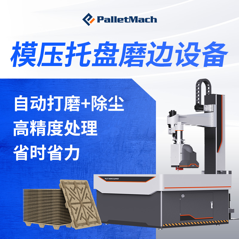 派莫托盘清边工作站由托盘清边机械手与托盘定位平台两大核心部件组成,可实现托盘边缘的自动化精修。 派莫托盘清边工作站专为模压托盘生产线设计,与模压机生产节奏深度匹配,实现自动模压托盘生产线托盘磨边协同作业模式,同时也支持独立的手动运行模式。